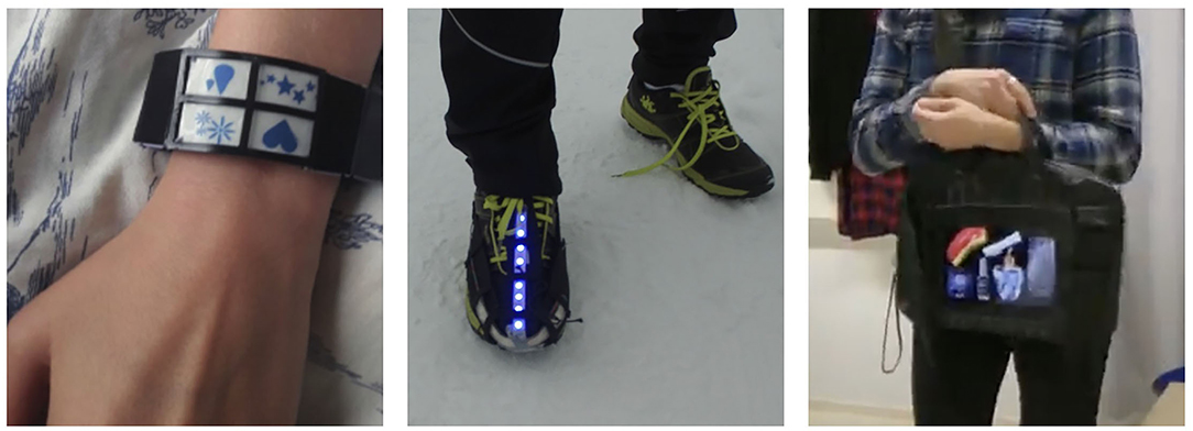 In the accessories space, our prior study has explored adding smart functionality to, e.g., handbags, shoes, bracelets, and armbands (refer to Figure 5). For some, handbags and particularly the personal nature of their contents are almost sacred. In our study, we prototyped the addition of a display to the surface of a handbag and explored users, reactions to functionality such as changing color to match an outfit and showing a view of the items contained in the bag (Colley et al., 2016). While much work has explored the integration of sensors to shoes, e.g., sensing gait, few works have considered the potential of footwear as a medium for output. In our prior study, we have presented a design space for shoe displays, identifying aspects such as the scope of visibility, content, visualization style, and usage context (Colley et al., 2018). Based on a prototype and user study, the peripheral visibility of shoe displays, e.g., when running, was identified as a potential design parameter that could be leveraged (Colley et al., 2018). The level of visibility was also an issue in our prior study using a pair of bracelets to communicate between partners in a long distance relationship (LDR) (Jarusriboonchai et al., 2020). In this research, we reported that simple communications through a wearable device could provide an additional channel for communication, with the wearable form factor being critical in creating the feeling of being always connected.