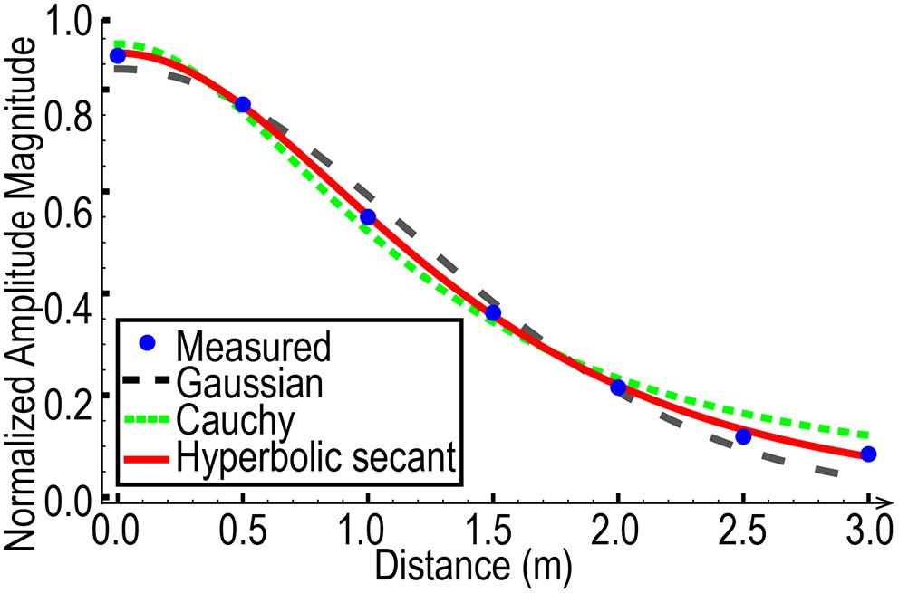 where fk = Akfs+mk and sincx = sinx/x hold. Thus, the unique frequency mk can be extracted. Note that the amplitude spectrum |βmk| is affected by η and the sinc function. The attenuation of magnitude affects the accuracy of positioning, so η must be set properly. Note that is the product of attenuation of the LED's signal and transfer efficiency. We assume the attenuation of the LED's signal is inversely proportional to the square of the distance and attenuates by the cosine of the radiation angle θ. However, it is difficult to model the attenuations theoretically because reflecting properties are very complicated in the real environment (Zhang and Yang, 2020). Our previous work (Shimada et al., 2018, 2020) comparing different mathematical models showed attenuation on the floor can be approximated by a hyperbolic secant distribution as shown in Figure 3. Therefore, the following equation
