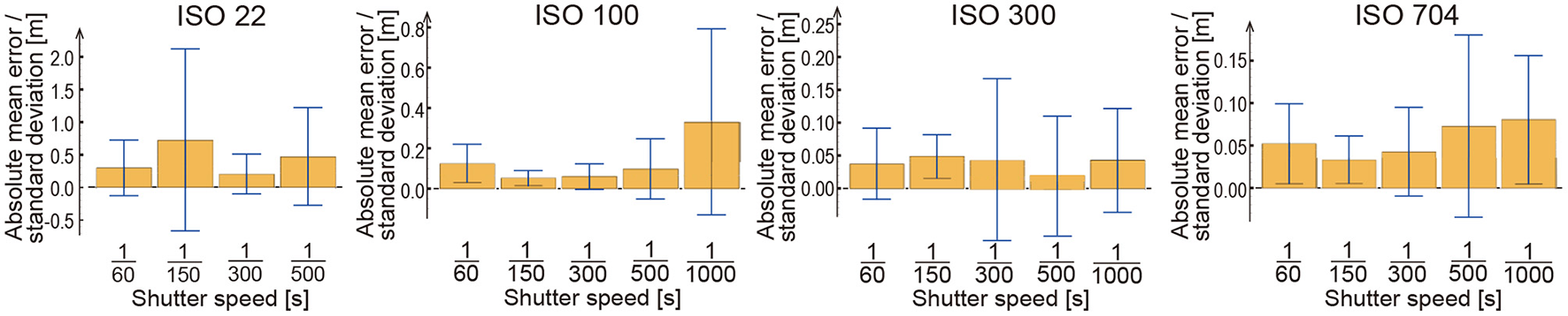 Absolute mean errors (rectangular bars) and standard deviations (error bars) of the estimated distance for each ISO and shutter speed setting.