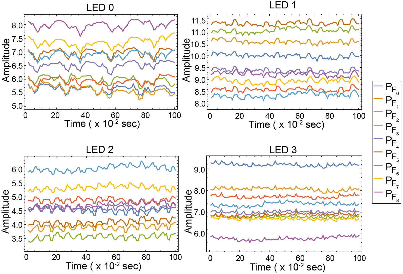 Let us assume that the camera frame rate is fc = fs, the shutter cycle is Tc = 1/fc, the exposure time ratio is η, and the exposure time is ηTc. By taking N images with the camera and separating the received light in the frequency domain, it is possible to extract the signal intensities of the unique frequencies. Therefore, the number of detectable LEDs is N/2−1, and mk<N/2 should be satisfied as per the sampling theorem. By capturing bk(t) from the kth LED with a camera, the resulting brightness Ini of the PFi on the nth image is an integral: