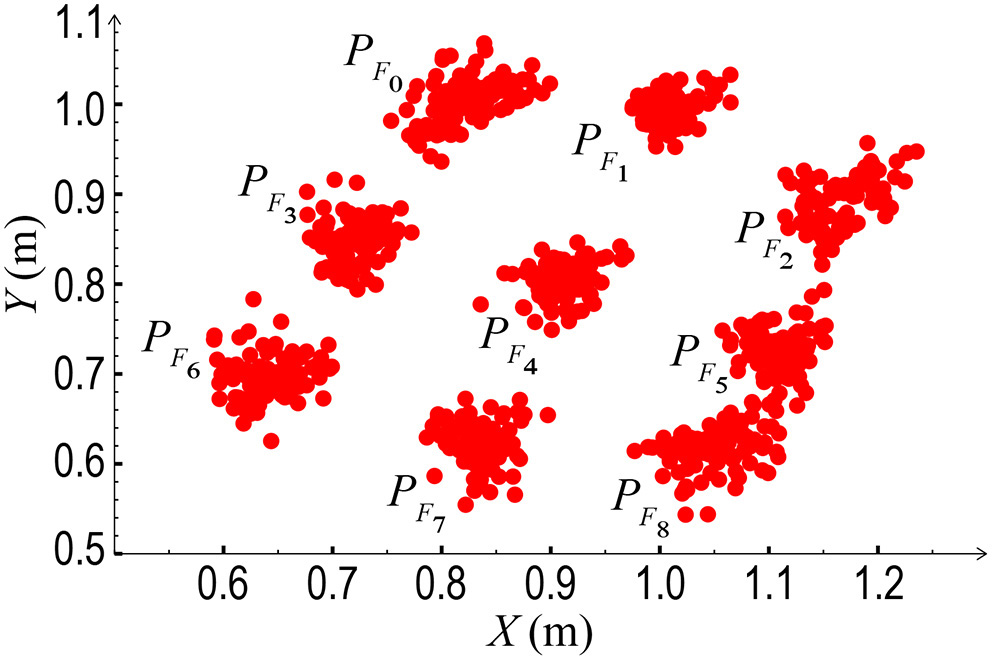The second step is to obtain PFi-captured positions on the floor using three or more estimated by the previous step. Note that PFi has a one-to-one correspondence with (u, v) on the U−V plane. Now, we assume that three perpendiculars from the light sources pass through the floor at the points (xL0, yL0), (xL1, yL1), and (xL2, yL2) (see Figure 2). Suppose that the estimated distances from these intersection points to the point (xFi, yFi) are as explained in Section 3.1. (xFi, yFi) is given by solving the following equation as an optimization problem:
