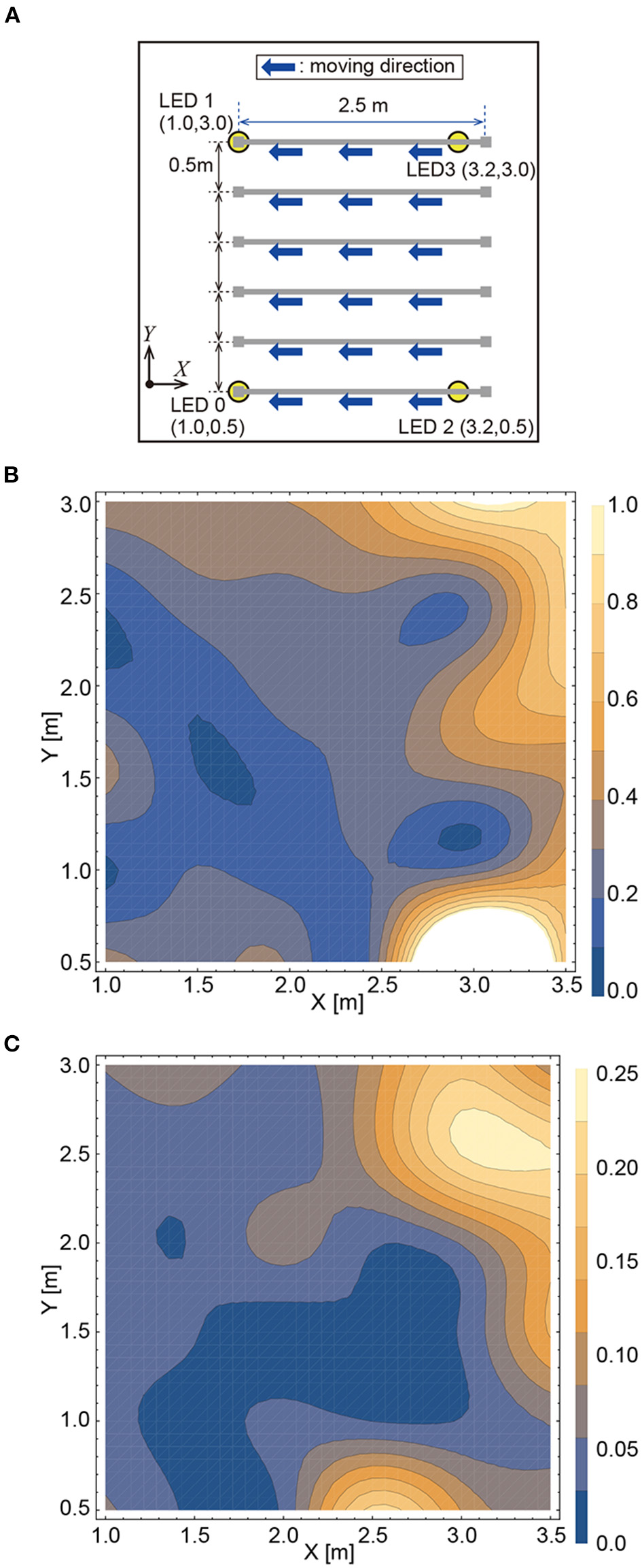 Note that (xF0, yF0) is the floor 2-D coordinates PF0, calculated using the corresponding pixel captured by the camera. Unless otherwise noted, all the experiments regarding the ranging performance evaluations were conducted as follows: only LED 0 (k = 0) was used and each measurement point was set at 0.5 m intervals from just below the LED (d0 = 0) to d0 = 3.5 m, and 100 measurements were taken at each point. Based on each amplitude spectrum obtained, the distance d0 was estimated by the parameter estimation using equation (7). In experiments except those in Section 5.2.3, the floor was illuminated only by the four LEDs. Existing fluorescent lights were turned off and direct sunlight was blocked using window shades.