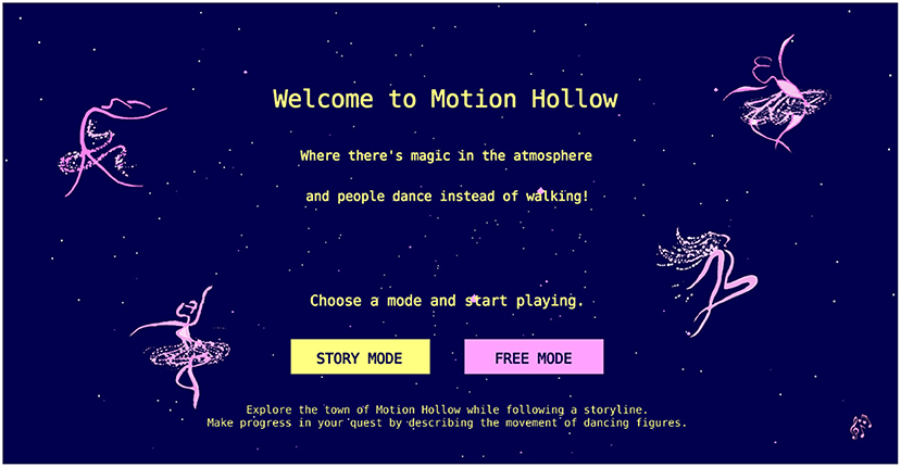 Before starting the experience, the users have to read and agree with the Terms of Use, which state that there are no right or wrong answers. They are then presented with a starting screen which offers two playing modes to choose from. The Story mode immerses the players in a narrative where they need to complete quests to reach the ultimate objective: break the neutrality spell and help the Empresses and Motion Hollow restore their identity (Section 4.1). These quests involve annotation of dance segments. The Free mode invites users to perform the same annotation tasks without the story concept (Section 4.2). A short description of each mode is provided to help the users make their choice (Figure 3). A short informational video overview of the experience can be found here.