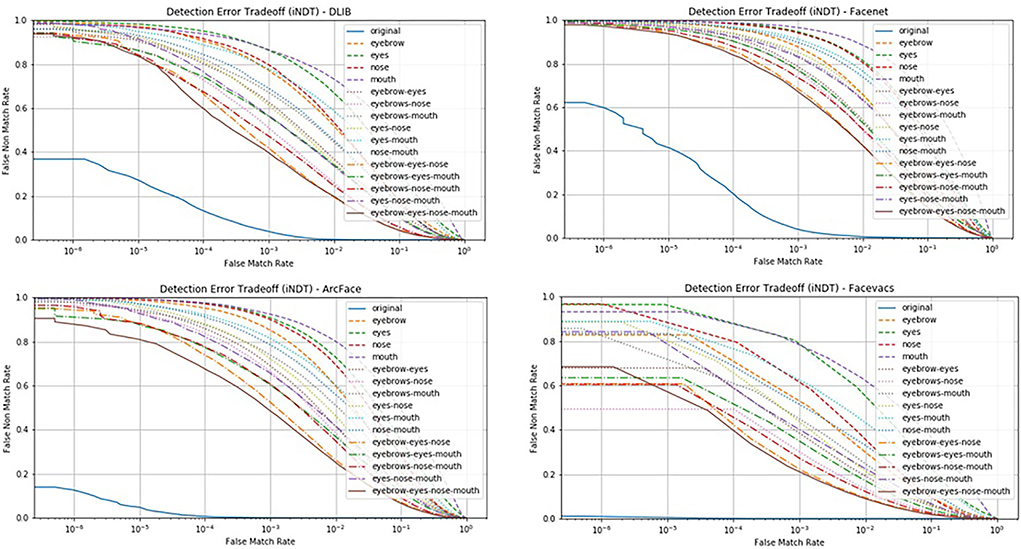 Vice versa with the NDT experiment, the iNDT observed the discrimination information in the face by neutralizing the whole face except the certain area in the face parts, namely, eyebrows, eyes, nose, and mouth. In other words, the iNDT experiment remained the original face component on the average face. We observed the performance of FR systems using the DET curve. Figure 7 shows the behavior of all FR systems. In contrast to the NDT experiment, the lower the error the higher the contribution of the face part.