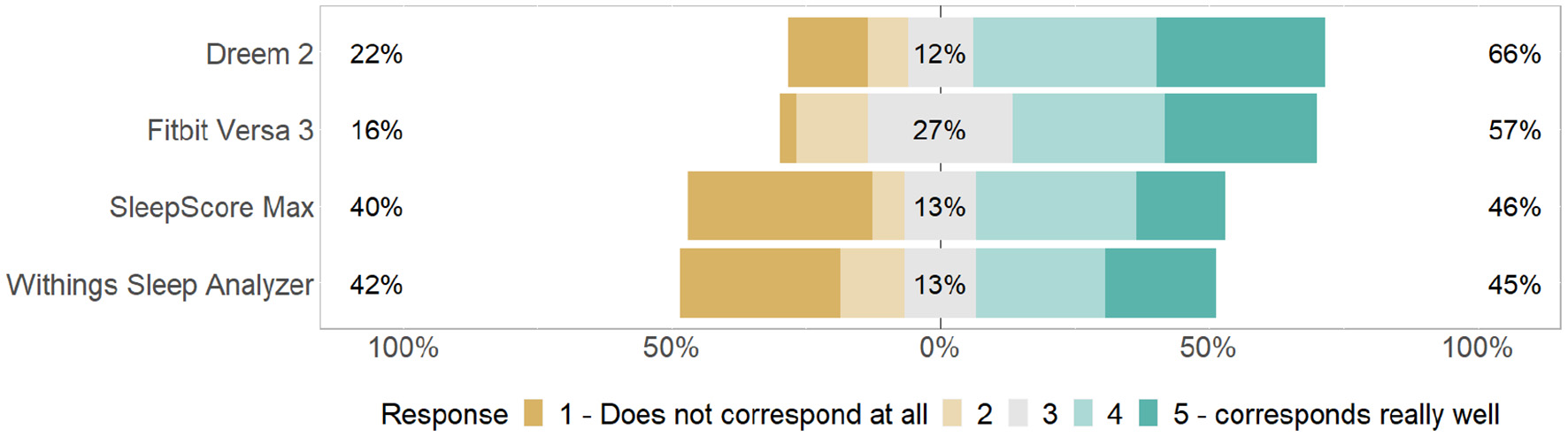 How well does device provided sleep metric correspond to your feeling or alertness or restfulness (5-Point Likert scale per device: Does not correspond-Corresponds)