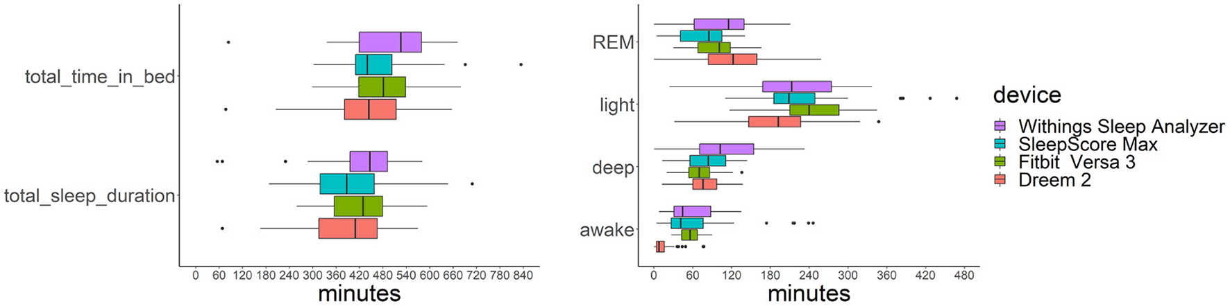 Compared to PSG, sleep-staging Fitbit models show no significant difference in wake after sleep onset, total sleep time, and sleep efficiency but it underestimates sleep onset latency (Haghayegh et al., 2019). Compared to a medical device, Fitbit tends to overestimate the probability of staying in a sleep stage while underestimating the probability of transiting to another stage (Liang and Chapa-Martell, 2019). This can lead to prolonged durations of sleep stages.