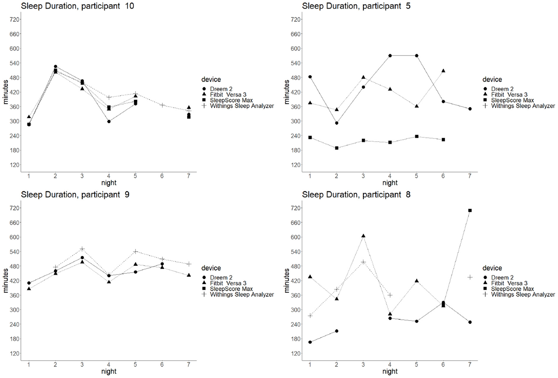 SleepScore Max (7/10 participants) and Withings Sleep Analyzer (6/10 participants) were expected to be the most straightforward devices to use, as they are not worn but placed in the sleep environment. Further, Dreem 2 was expected to be the hardest to use or require the most effort (6/10 participants), as it requires the participant to put it on every night before bed. People who are used to wearing a watch expected Fitbit Versa 3 to be easy to use: “I already use a wristwatch, so I think Fitbit Versa 3 will be easy and comfortable.” (P1). P4 thought that if a device requires calibration before use, it will be more burdensome to use.
