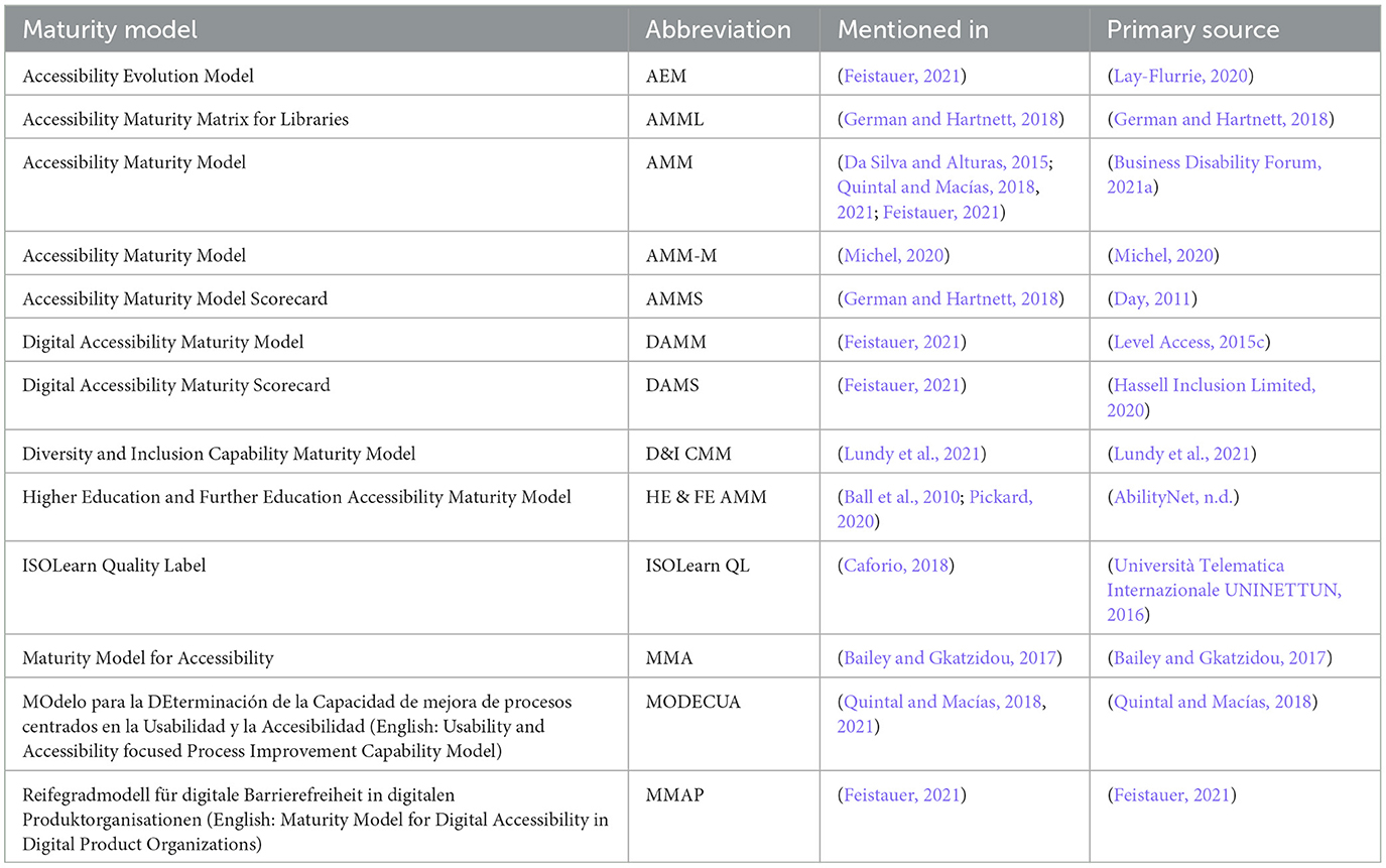 3. ^Note: In this chapter, acronyms are used to reference the accessibility maturity models that were introduced in chapter 4. Please refer to Tables 1, 2 for the meaning of the acronyms.