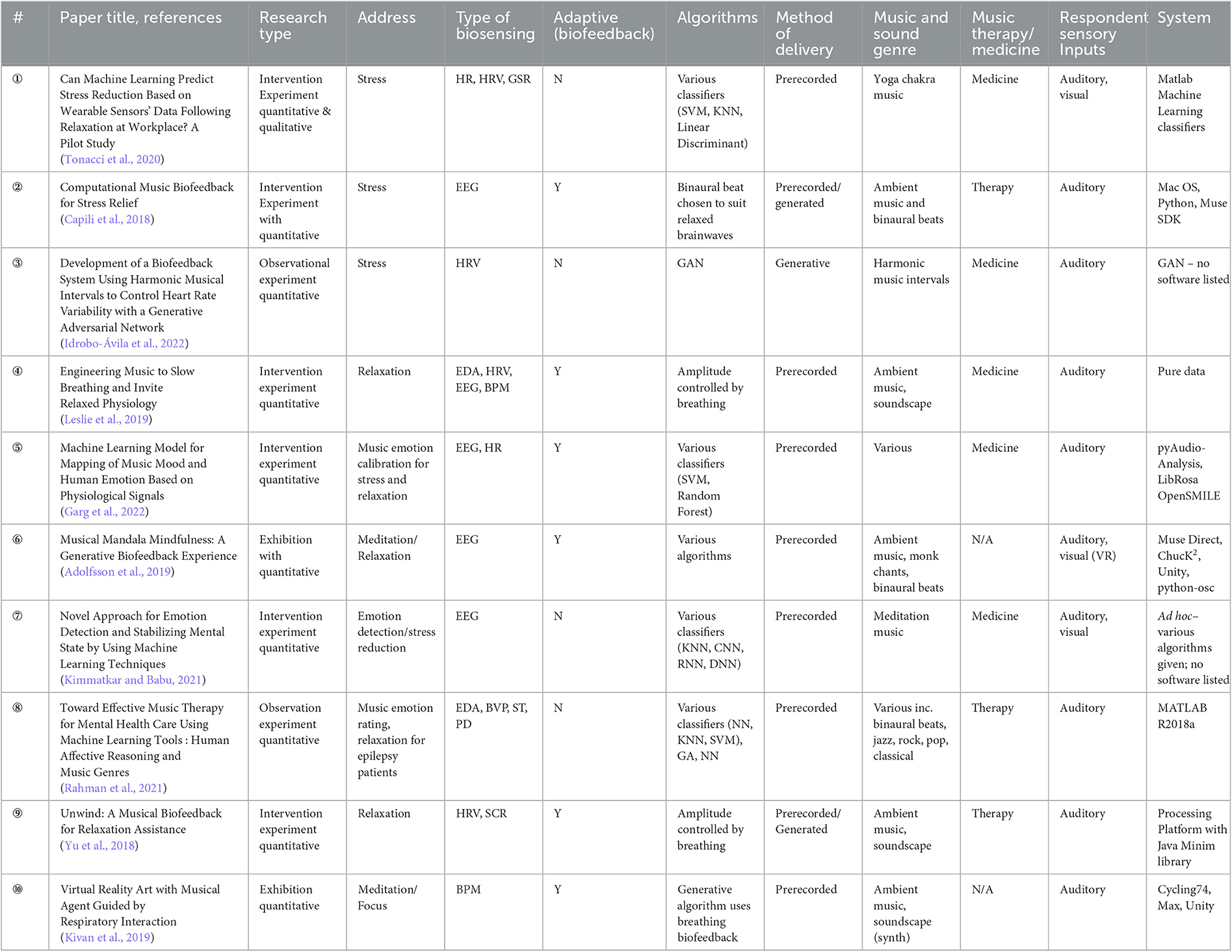 Most of the current apps offering therapeutic use of music do not include biosensing or self-administered feedback questionnaires. Current focus offers artists whose music can be downloaded based on a subscription rather than a digital music system that responds to biosensing coupled with ML. An app named Endel shown in Table 2 does offer biosensing (HR) and other inputs such as counted steps, current weather, time-of-day, and location. This application uses inputs to generate music that is contextual to the user's environment and biosensing capabilities of the device (McGroarty, 2020; Kleć and Wieczorkowska, 2021).