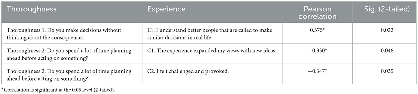 Results and discussion: The results suggest that the game design offered an engaging game experience and was effective to promote reflection and perspective taking on different aspects of crisis management, as well as the supporting role of relevant historical information in the decision-making process. The study also reports correlations between specific personality traits, such the DMQ Thoroughness and Principled, the FFM Conscientiousness and Openness to experience with specific aspects of the game experience, such as absorption, perspective taking and the preference for more choices in the gameplay.