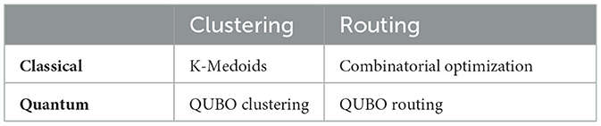 In order to find the best approach in terms of technology and time-to-market applicability, we solve the VRP using a hybrid approach (Feld et al., 2019), which exploits both classical and quantum techniques to find an optimized solution. The hybrid algorithm models the VRP problem using a 2-phase approach: first clustering or grouping the customers, and then finding the optimal routes inside each cluster. This approach is known as a cluster-first, route-second algorithm. For each of the two phases, we developed both a quantum and a classical algorithm to compare them and determine the most effective combination. The algorithms used are shown in Table 2.