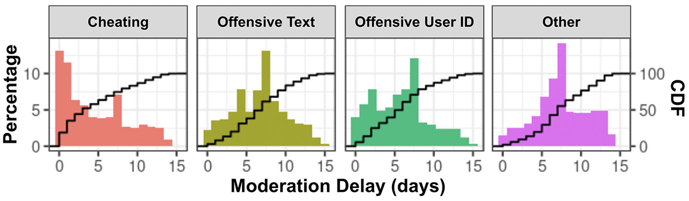 Evidence: In Figure 2 we report the delay in moderation by different disruptive player behavior categories. This figure has four panels, in the first we show the distribution of the delay in the moderation of a reported cheating behavior. Subsequent panels report delays for reports of offensive text chat, offensive user identification and other offenses respectively. The x-axis represents the number of days that have passed since the report submission. The y-axis on the left reports the percentage of reports reviewed by moderation on a given day. The black line depicts the cumulative distribution function (CDF) reporting the percentage of all the reports that have been reviewed. The corresponding y-axis scale for the CDF is presented on the right side of the graphs. This only includes the reports that have eventually been reviewed by the moderation team and hence adds up to 100%. This delay is measured as the number of days from when the first report about a player was submitted until the time the moderation examined the reported case. We report the precise data extraction and analysis involved in producing this figure in Appendix 1.2. The reason for existence of a delay can be due to the need for manual inspection, or even in an automated system due to the need for accumulation of sufficient evidence to justify taking an action (e.g., threshold of reports).