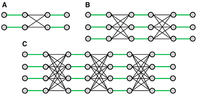 Figure 1. An illustration of the (A) G1, (B) G2, (C) G3 maximum cardinality matching problems. The maximum matching is reached when all edges are selected in the sparse parts of the graph (in green).