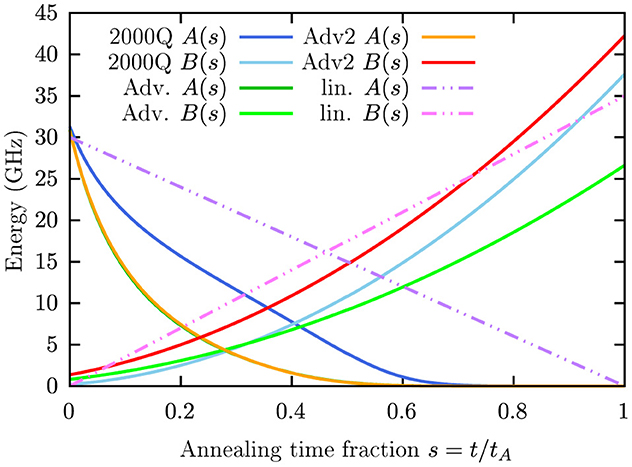 numerically, where |ψ(t)〉 denotes the state vector. For this, we use the Suzuki-Trotter product-formula algorithm (Trotter, 1959; Suzuki, 1976, 1985; De Raedt, 1987; Huyghebaert and De Raedt, 1990). This method yields a full state vector simulation of an ideal, closed system, i.e., we have direct access to the theoretical success probability, and we do not need to acquire an estimate from sampling. For the decomposition of the Hamiltonian, we use (t) = A(t/tA)0+B(t/tA)f, with A(s = t/tA) and B(s = t/tA) either linear annealing schedules or the annealing functions of the particular D-Wave processor that we simulate. All annealing schedules are shown in Figure 2, and 0 and f are given in Equations (1, 2), respectively.