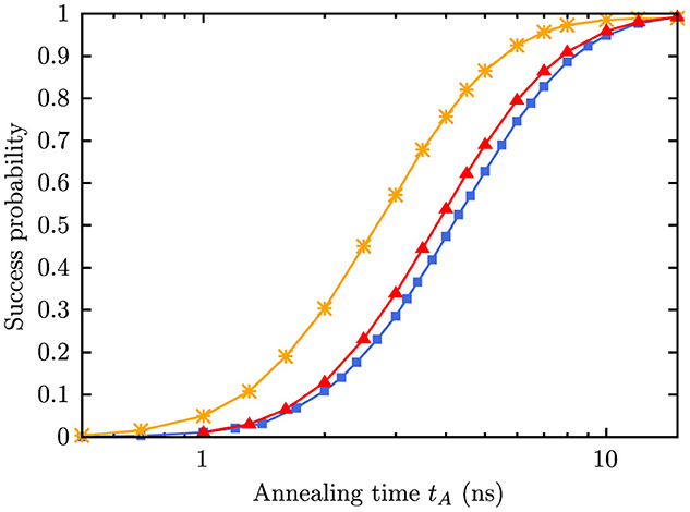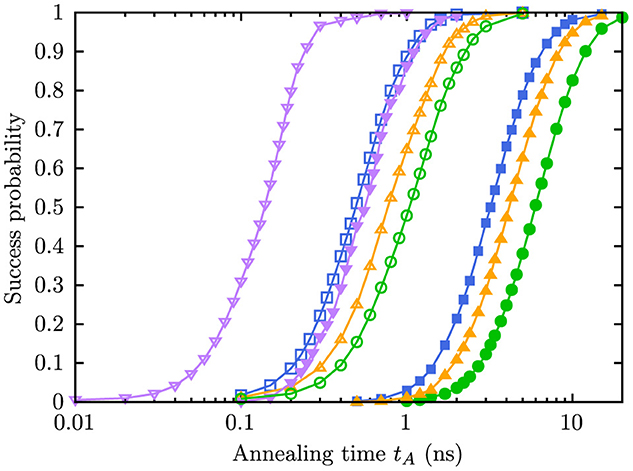 Figure 3 shows the success probability as a function of annealing time for four different annealing schedules. Three annealing schedules are taken from the DW_2000Q_6, Advantage_system_4.1, and Advantage2_prototype1.1 QPUs, the fourth is a linear one, and they are shown in Figure 2.