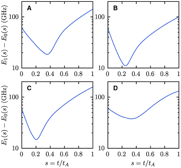 Figure 4. Energy E1(s) − E0(s) between the ground state and the first excited state for the G1 graph as a function of the anneal fraction s. (A) The DW_2000Q_6 annealing schedule is used. (B) The Advantage_system4.1 annealing schedule is used. (C) The Advantage2_prototype1.1 annealing schedule is used. (D) The linear annealing schedule is used.