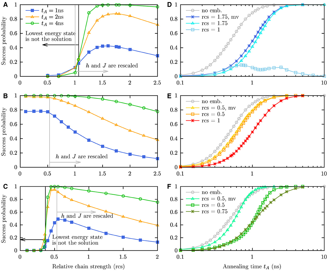 Figure 5. Success probability for the G1 graph (A–C) as a function of the relative chain strength for different annealing times indicated in the legend and (D–F) as a function of annealing time for different chain strengths indicated in the legend. The DW_2000Q_6 annealing schedule is used, and the rows show different embeddings. Only the solution state is counted as success; the results with broken chains are not considered unless indicated by “mv” which means chains are fixed by majority vote. In case of the chains of length 2, the chance to fix a chain is 50%. The success probability for the unembedded case is shown in gray for comparison. (A, D): Embedding onto the Chimera topology with 4 chains of length 2. (B, E): Embedding onto a modified Chimera topology with additional couplers yielding 2 chains of length 2. (C, F): Embedding onto a square grid with 2 chains of length 3.