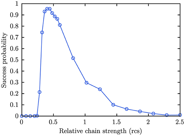 The value of the chain strength has to be chosen carefully (Choi, 2008; Raymond et al., 2020). If the chain strength is chosen too weak, low-energy solutions of the embedded problem might favor solutions where qubit chains are broken, i.e., physical qubits that represent the same logical variable have different values. In such a case, post-processing has to be applied to obtain a valid logical variable from the physical qubits, but the resulting bitstring does not necessarily have to be a low-energy solution of the original problem. If the chain strength is chosen too strong, all qubit chains act as one logical variable but their actual value might be random. This is due to the limited range and precision of the hi and Jij values. The problem has to be rescaled too much so that the hi and Jij values become too small (i.e., below the precision limit) so that all valid solutions get too close and, thus, difficult to separate, leading to random outcomes. Moreover, in principle, the chain strength should be optimized to find the sweet spot (Grant and Humble, 2022). The default procedure “uniform torque compensation” (D-Wave Systems Inc, 2023b) provided in the Ocean SDK may (see Chen et al., 2021) or may not (see Carugno et al., 2022) work well enough.