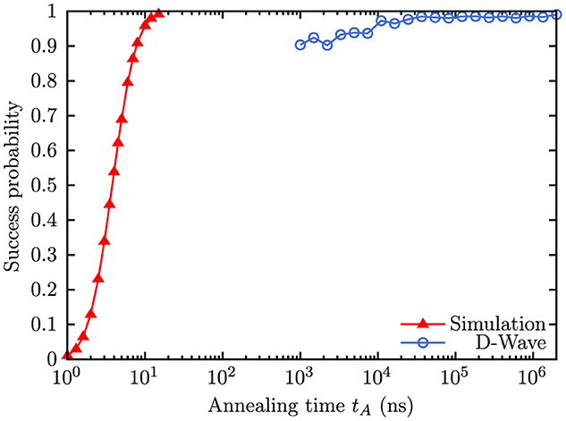 The ideal QA simulation can be used to compare aspects of the D-Wave processors which are inaccessible on the real devices. For instance, we can compare the different annealing schedules of the processors without the need to apply minor embedding since in the simulation, we have all-to-all connectivity between the qubits.