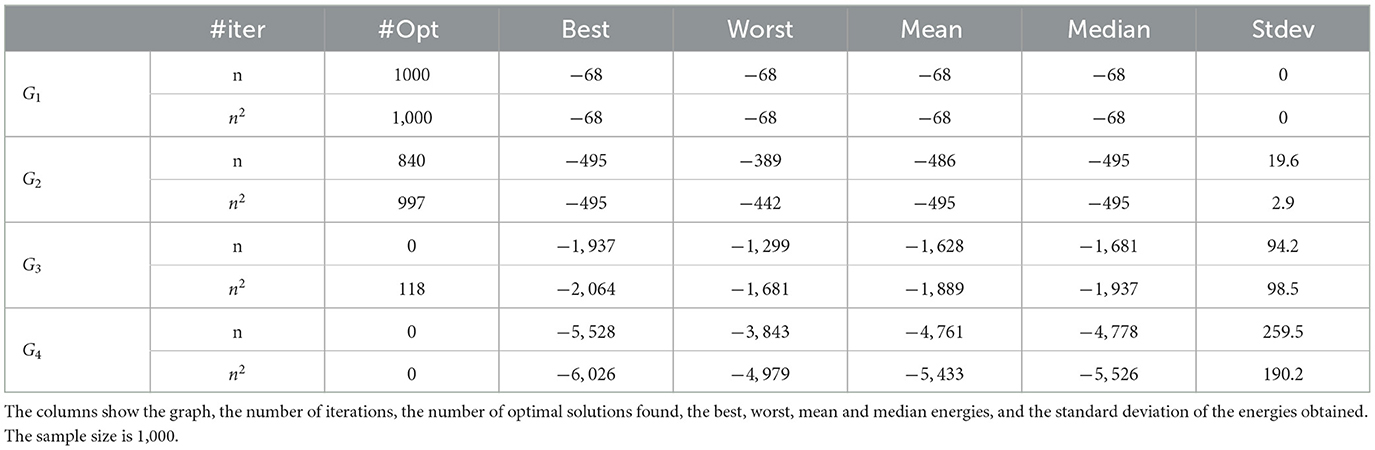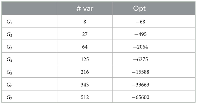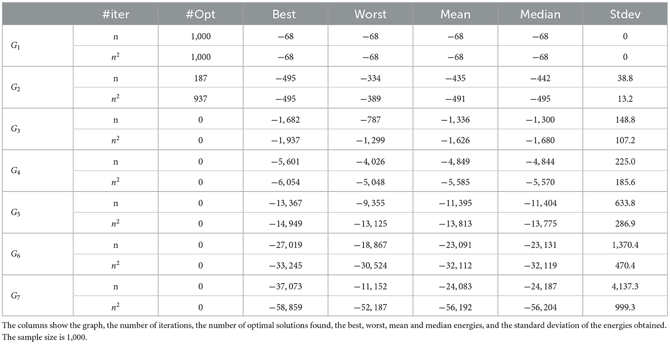 As stated in the study mentioned in Vert et al. (2021), finding the optimal solution without the embedding for the Gn series up to G7 is not difficult for SA with a relatively low number of iterations. Nonetheless, taking the embedding into account, D-Wave QPUs compare very favorably to SA. When using the same embedding of the Chimera topology for the cases up to G4 also for SA, SA yields similar results as the 2X QPU only when utilizing αcard(E)2 annealing steps (α being chosen around 1,000) per plateau of temperature, which is considered a costly but usually accurate parametrization of SA. Table 5 shows the results of SA on the embeddings onto the Advantage_system4.1 QPU. As can be observed, the D-Wave results remain mostly comparable to the same high-quality SA heuristic with αcard(E)2 annealing steps per plateau of temperature. Nonetheless, it is worth noticing that obtaining these SA results with G7 costed more than 5 days of computing time on a AMD 7,702 P, 2 GHz with 64 cores (C++ optimized SA code running in parallel with several instances per core to obtain a statistical significance). In this regard, we can conclude that even by taking the pre-processing into account, the Advantage_system4.1 QPU compares well with SA on the embedded versions of the Gn series.