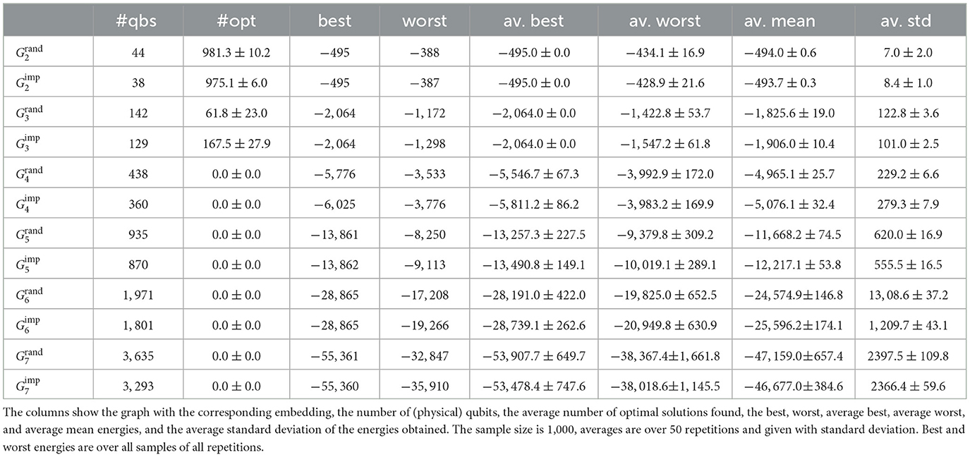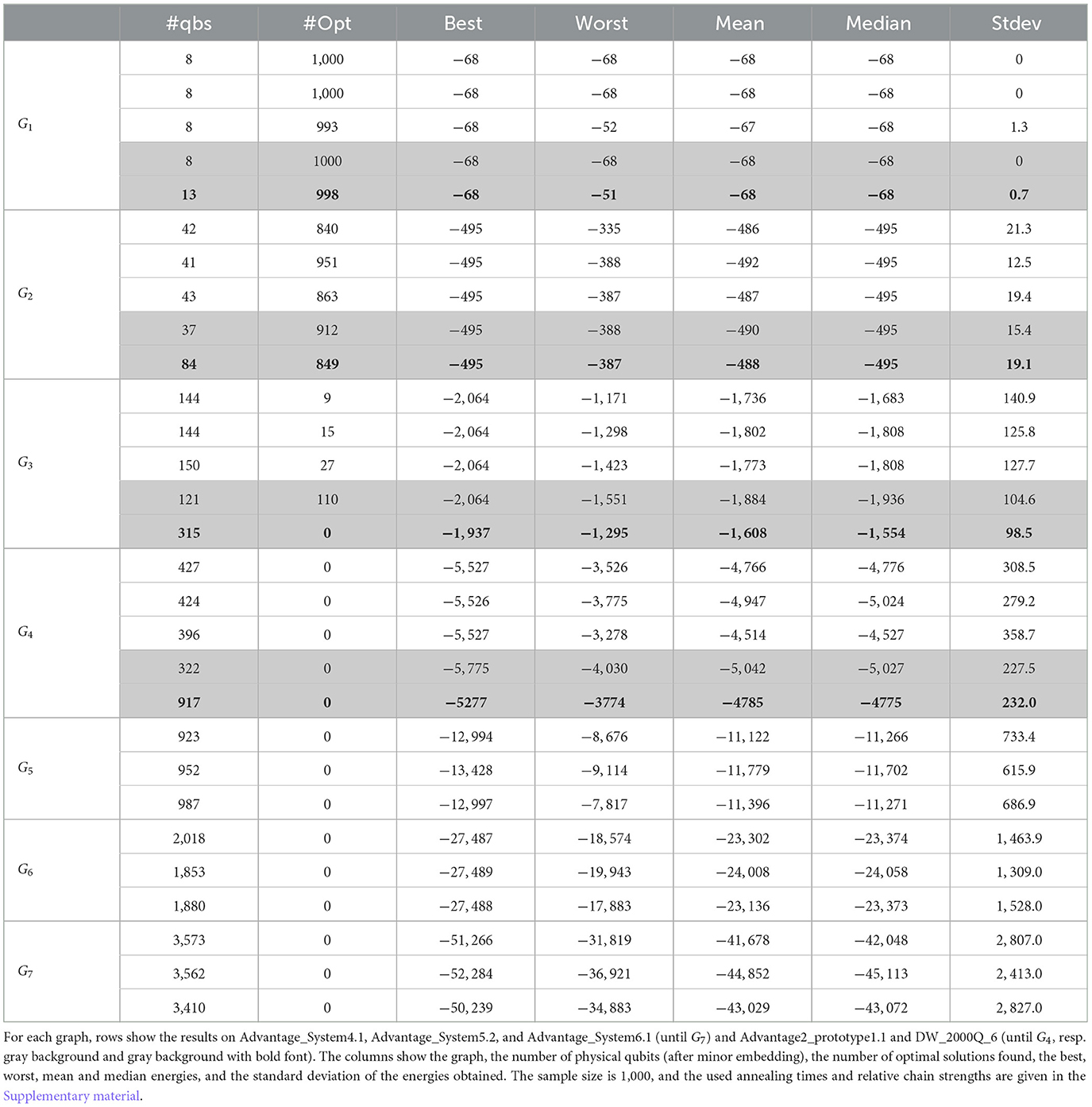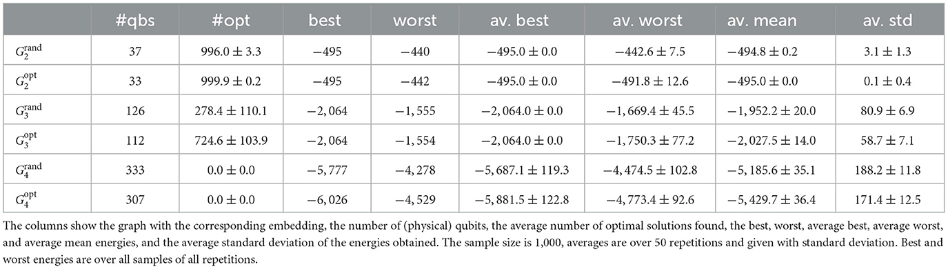 Taking into account the results on the older generation D-Wave 2X processor which can be found in the study mentioned in the reference (Vert et al., 2021), we find significant improvement from D-Wave 2X (5.1%) to D-Wave 2000Q (84.9%) for the G2 graph. For the G1 graph, all processors perform quite well, and there is no significant difference in success rates between the different generations. Similarly, there is not much difference in the success rates between the D-Wave 2000Q and newer generations for the G2 graph, although the embedding onto the DW_2000Q_6 requires approximately twice as many physical qubits as embeddings onto the newer processors. For the G3 graph, neither D-Wave 2X nor D-Wave 2000Q returned the optimal solution in our case, but the “best” energy returned by the D-Wave 2000Q is lower than the D-Wave 2X. We note that in the study mentioned in the reference (McLeod and Sasdelli, 2022), D-Wave 2000Q was able to return the optimal solution at least once. Advantage_system and Advantage2 prototype processors were able to sample the optimal solution several times, and with improved embedding (see below), Advantage2 prototype even reached a success rate of approximately 50%. For G4, none of the tested processors returned the optimal solution, and surprisingly, D-Wave 2X and the Advantage_system processors all achieved (almost) the same “best” energy (unless an improved embedding was used on Advantage_system4.1). McLeod and Sasdelli (2022) also found the same “best” energy on the DW_2000Q processor, and a slightly lower “best” energy on Advantage_system4.1 is very close to the one which we obtained with the Advantage2 prototype processor. For graphs G5 and higher, only embeddings onto the Advantage_system processors were possible, and the results are compatible with each other. We note that the values of the energies and the standard deviation are stretched due to the choice of λ = |E| = (n+1)3. Division by λ (as is also done to fit the values into the parameter ranges of the QPUs) would give more compact values and especially standard deviations, which are more comparable among the different instances. However, we decided not to divide by λ to keep the easy comparison to the previous studies in Vert et al. (2021); McLeod and Sasdelli (2022).