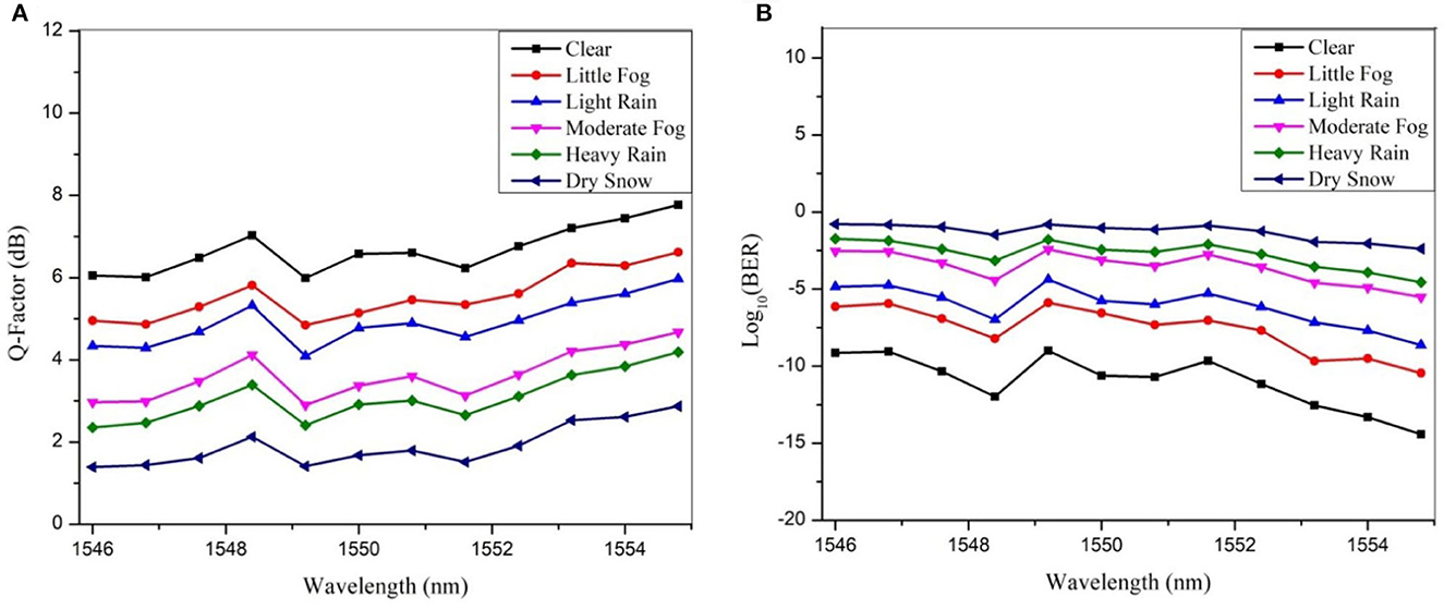 The Q-factor and BER values are determined for the proposed system under adverse weather conditions, and the results as a function of signal wavelengths are presented in Figures 5A, B, respectively. These values are calculated at FSO length of 1600 m. It is observed that under clear weather conditions, the minimum Q-factor achieved is 6 dB, which indicates a relatively good signal quality. The corresponding maximum BER value is 10−09. In the presence of little fog weather, the minimum Q-factor obtained is 4.84 dB. The Q-factor is slightly reduced compared to clear weather, indicating a decrease in signal quality due to the fog. The corresponding maximum BER value is 10−06. The minimum Q-factor drops even more to 4.09 dB in the presence of light rain. This drop in Q-factor indicates a significant degradation in signal quality as a result of rain attenuation. The maximum BER is measured at 10−05, indicating a higher occurrence of bit errors compared to both clear weather and little fog conditions. Under moderate fog conditions, the minimum Q-factor recorded is 2.9 dB. The maximum BER reaches 10−03, signifying a substantial increase in the probability of bit errors. In the case of heavy rain, the minimum Q-factor observed is 2.35 dB. The heavy rain causes severe signal degradation, resulting in a further reduction in signal quality. The maximum BER in this scenario is 10−02. Finally, under dry snow conditions, the minimum Q-factor observed is 1.39 dB, which is the lowest value among all weather conditions. The dry snow considerably reduces signal quality due to scattering and absorption effects. The maximum BER reaches 10−01, indicating a significant number of bit errors and greatly affected data transmission. In summary, these results demonstrate the sensitivity of the system's performance to challenging weather conditions. The system performs well in clear weather conditions, with a high Q-factor and low BER values. However, if the weather gets worse, both the Q-factor and BER are adversely affected, which lowers the signal quality and raises the probability of bit errors.