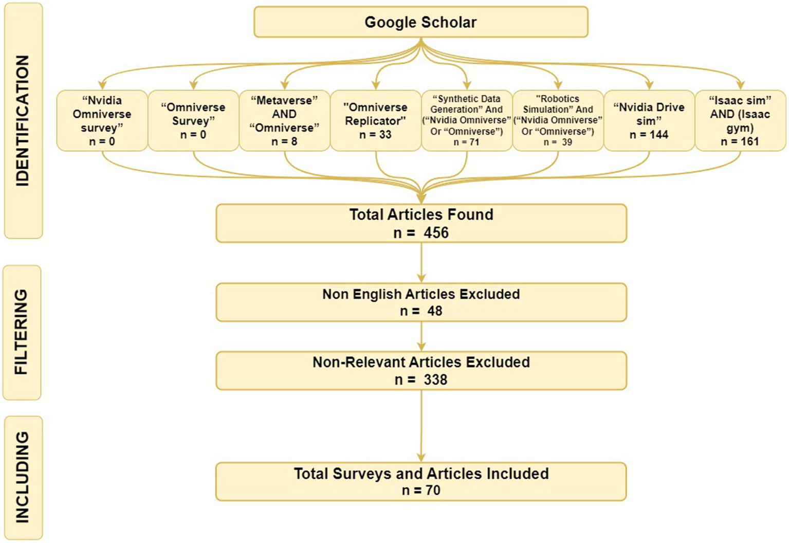 The initial search phase resulted in a total of 456 papers. We then conducted a thorough review of the full text of each paper to assess their relevance to our research questions, ultimately narrowing the selection down to 70 papers based on specific inclusion and exclusion criteria.