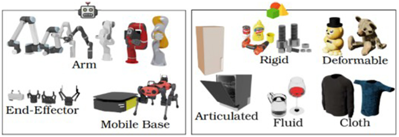 Available robots and manipulatable objects in Nvidia Isaac orbit (Mittal et al., 2023).