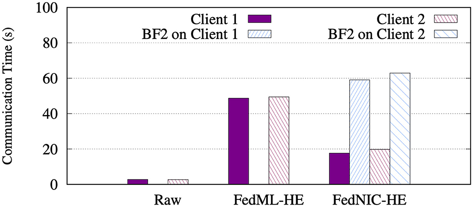 The other possible future study direction is to leverage the existing compression/decompression engine on SmartNICs [e.g., BlueField-2 (NVIDIA, 2024)] to accelerate certain parts of the federated machine learning process. For example, previous study, by Bitar (Liu et al., 2022), shows promising results by leveraging the compression engine on NVIDIA BlueField-2 to accelerate the partitioning process of the datasets. Utilizing hardware acceleration offload method, Bitar is able to achieve 4.6 − 8.6 × higher throughput than software-based solutions for serialization. Given such success, a future study planned is to explore the possibility of leveraging the compression/decompression engine to accelerate corresponding steps of HE operations.