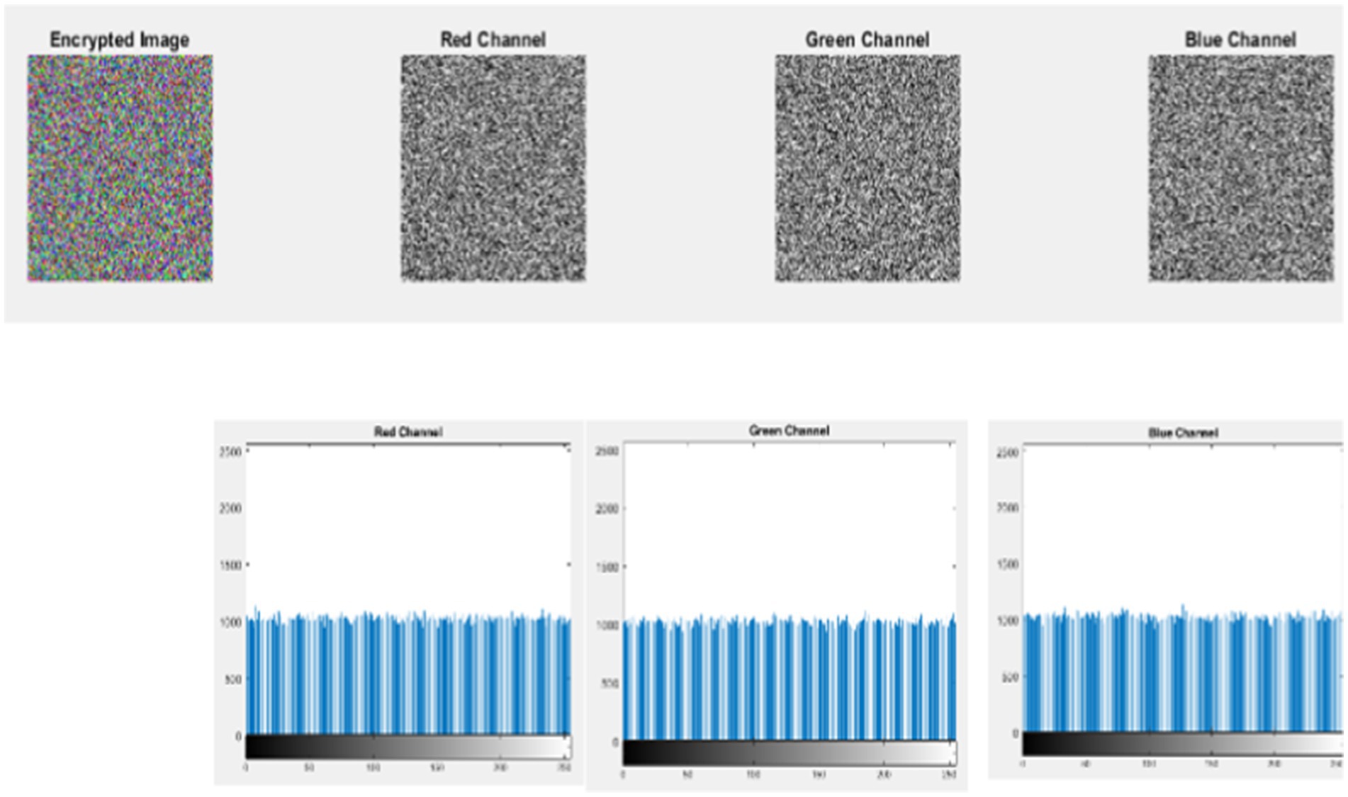• The histogram analysis of encrypted images reveals a uniform distribution of pixel intensities, suggesting that all pixel values possess equal probability. This uniformity inhibits attackers from conducting statistical analysis to identify patterns in the encrypted image.