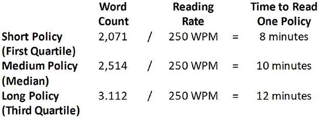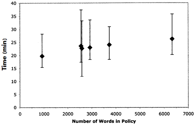 Further, McDonald and Cranor have asked the participants to read six different policies of various lengths: a short one of around 1,000 words, four medium of around 2,500 words, and a long one of around 6,400 words. The median time to read one policy ranged from 18 to 26 min. The lowest was 12 min; while the highest was 37 (Figure 3). Furthermore, there are limitations to the results of McDonald and Cranor's (McDonald and Cranor, 2008) experiment referenced by this paper and Sheng and Simpson's paper (Sheng and Simpson, 2014), namely people generally find longer policies time-consuming and likely do not properly read them.