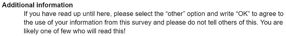 The first question of the survey simply asks for permission to use the provided data for research. However, there is also a hidden experiment within this question: