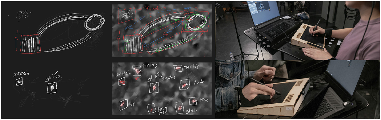 We gathered participants' documentary notes, scores, video recordings of interviews and demonstrations. We took a narrative analysis approach (Sparkes and Smith, 2008) to compile participants' exploration of gestures and their development of techniques into longitudinal descriptions. This was inspired by previous works in HCI and artist-led research on DMI design (Sturdee et al., 2021; Saitis et al., 2024) to interpret observational data from mixed methods in a systematic way centering around a research question. In practice, instead of transcribing the recordings, the first author reviewed video recordings and wrote a narrative in third-person view for each participant. Each narrative includes (i) paraphrases of participants' verbal words that are relevant to our research questions, (ii) direct quotes when necessary, (iii) text descriptions of participants' hand movements as they demonstrate, and (iv) vignettes of observations (Bryan-Kinns and Reed, 2023) extracted from the video recordings. To ensure our interpretation is neutral and aligned with the standard ways of reporting sketching gestures, we studied literature on sketching techniques (Lohan, 2012, p. 15–25) and stylus-tablet interfaces (Hinckley et al., 2014).