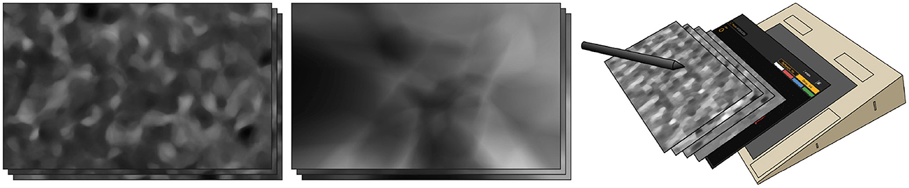 We used two algorithmic strategies to generate two terrains, respectively: a Variational AutoEncoder (VAE) (Kingma and Welling, 2013) and a Fourier-Compositional Pattern Producing Networks (Fourier-CPPN) (Tesfaldet et al., 2019). A terrain is fixed after it is generated. While the technical details and the procedure used for generating the two terrains can be found in the Supplementary material, here we visualize their differences in Figure 2 left and middle in the same way as Roma (2023): The width and height of the grayscale rectangles correspond to the width and height of the canvas. In each rectangle, the brightness at one spatial location represents the value of one latent vector dimension at that location. Given that our RAVE has 8 latent space dimensions, we can visualize a terrain by a stack of 8 grayscale rectangles. The functional difference between the two terrains is that the second terrain offers higher spectral complexity than the first one. That is, when the stylus moves for the same distance in the same amount of time on both terrains, the resulting snippet of sound from the second terrain is typically richer and more varied.