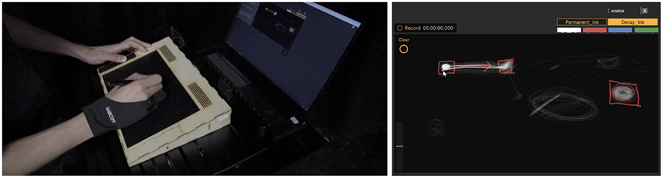The instrument's physical interface, shown in Figure 3 left, is constructed from wood boards, embedded with a medium Wacom Intuos2 drawing tablet (21.6 × 13.5cm canvas size) and a Bela Trill Bar3 slider. The slider bar next to the tablet was designed to be modular and can be quickly installed on either the right or left side to accommodate both left-handed and right-handed users. The drawing tablet connects to a laptop via USB. The slider runs on an ESP324 microcontroller powered by a portable charger, sending slider inputs to the instrument's software via the OpenSoundControl (OSC)5 protocol. We implemented the latent terrain in C++ as a Cycling '74 Max 86 external: nn_terrain,7 facilitating stylus inputs and rendering drawings in the canvas. It encapsulates ACIDS-IRCAM's nn_tilde8 to load pre-trained RAVEs. As shown in Figure 2 right, the terrain is embedded in a part of the Graphical User Interface (GUI).