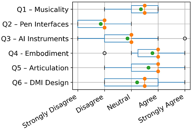 Participants' responses to each question statement are described in the box plot shown in Figure 4, showing median (green dots), first and third quartile (edges of the box), extreme values (whiskers), outliers (outlined dots), and mean value (orange double-dot). Participants' primary instruments and years of practice are shown in Table 2. We interpret the results as low familiarity with pen-based interfaces and AI-enhanced instruments, reasonable familiarity with musicality and ability to identify and articulate body-related experiences.