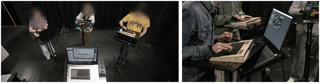 We held 6 recurrent 90-minute workshop sessions, each with 3 musicians. Our study was inspired by artist-led methods (Benford et al., 2013; Bryan-Kinns and Reed, 2023). In particular, musicians lead the content creation on our instrument probe presented in Section 3, and we aim to study what the instrument affords them to do, and how they develop performance techniques on it. All workshop sessions took place in person in a performance room at Queen Mary University of London (QMUL). The study was approved by QMUL's Research Ethics Committee.10