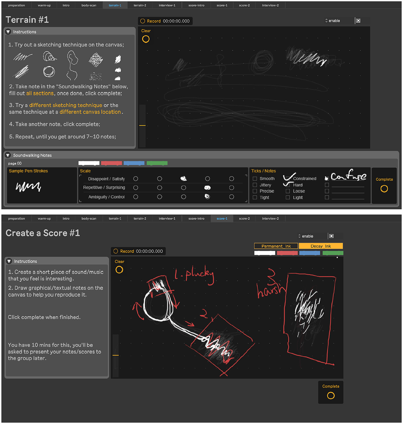 Then, participants spent 20-min exploring and finding pieces of sound or music in both terrains, each for 10-min, and drew a “score” on the canvas to help them perform these pieces at a later time. They were encouraged to be creative and use any kind of notation (graphical/textual) in the score. We did not limit the duration of the pieces.