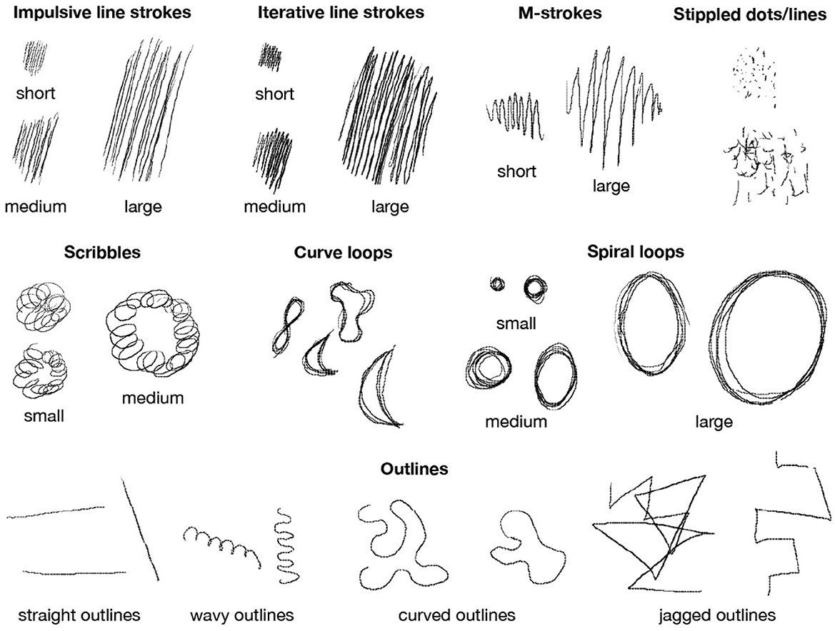 In Table 3, we list drawing strokes resulting from participants' sound-producing gestures. We distilled this list from participants' notes and scores based on our visual observation. And we documented and categorized them with reference from the literature on pen sketching techniques (Lohan, 2012, p. 15–25). We observed six categories: impulsive/iterative line strokes, M-strokes, scribbles, stipples, loops, and outlines. We divided the size of the drawing strokes into short/small, medium, and long/large. Figure 7 illustrates these categories and divisions.
