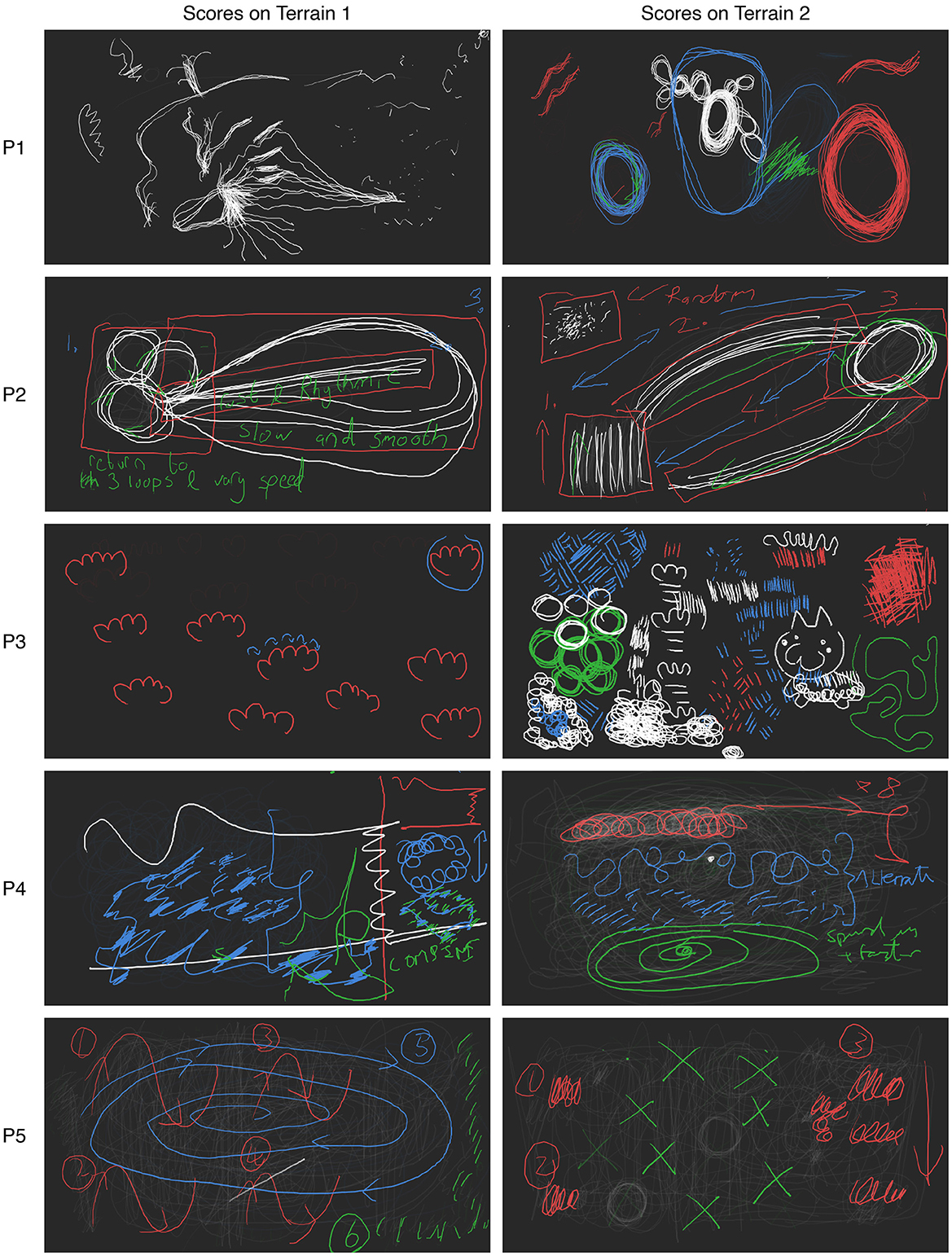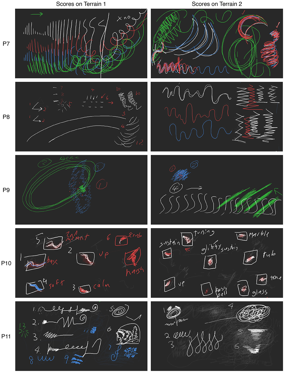 We use this collection to show how participants' choice of techniques changed between the exploration and score creation activities. Two main inventive techniques that the investigator did not initially demonstrate to the participants but used by them were: (i) “M” shaped strokes, a technique similar to hatched line strokes but have larger distances between each line, typical examples are the zig-zag lines that appeared in P8's score on Terrain 2; (ii) wavy outlines, a technique similar to curved outlines but more structured in terms of the shapes. Compared to the techniques we initially demonstrated, both inventive techniques focus more on the drawing strokes' shape in the visual aspect instead of the pen-stroking movements in the gestural aspect. Especially the wavy outlines from P8, which they described as “quite meditative to draw.” In addition, P7 and P10 opted to limit the size of their movement to small areas because they felt that the sound produced by smaller shapes was consistent every time they drew them, while the sound produced by larger shapes seemed to be random. Notably, all techniques used by P10 in their score were either short or small strokes while they experimented with medium size shapes and outlines.