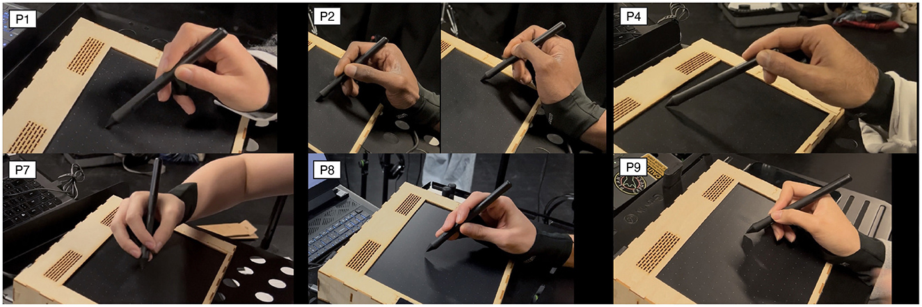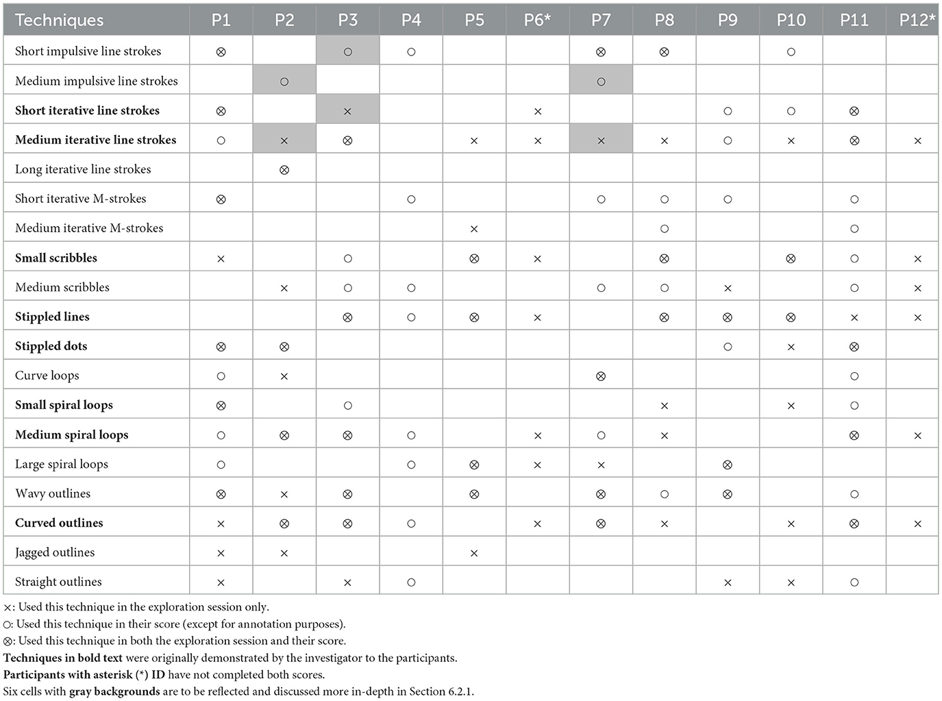 We documented and grouped techniques according to our visual observation of the resulting drawing strokes. However, we found that the visual appearance of drawing strokes cannot comprehensively represent the diverse movements participants have used. Various expressions were used in the same type of drawing stroke. For instance, P2 and P4 both used curved line strokes, but P2's movements tended to be careful and steady, while P4's tended to be fast and scrawled. Therefore, we use the techniques collected here to complement the individual demonstration data in Section 5.2, which describes the diverse and nuanced differences in how participants enact their techniques.