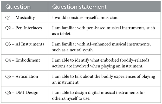 To understand the participants' background in musical instruments, tablet and pen-based interfaces, AI-enhanced musical instruments, bodily experiences in musical instruments, and DMI design, we gathered self-report measures of their familiarity with these items. In a pre-task survey, participants were asked to rate on a 5-point Likert-type scale (Strongly Disagree - Disagree - Neutral - Agree - Strongly Agree) on six question statements listed in Table 1. The survey also gathered participants' self-reported primary instruments and years of practice.