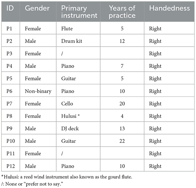 Recruitments for participants were sent to postgraduate research groups interested in music and AI in London, the UK. A total number of 18 participants were recruited for the study. They were each reimbursed with a £20 (GBP) voucher. They were divided into 6 groups of three, each group allocated to one workshop session. Two participants opted out of the data analysis, 3 participants' data was incomplete due to late arrival, and 1 was incomplete due to a system crash. Therefore, the study collected 12 participants' data (6 Females, 5 Males, and 1 Non-Binary), and they all provided written consent for data collection, data analysis, and displaying their creations. Although we did not limit participants' handedness when distributing the call for participation, all participants were right-handed. Each participant was given an ID from P1 to P12.