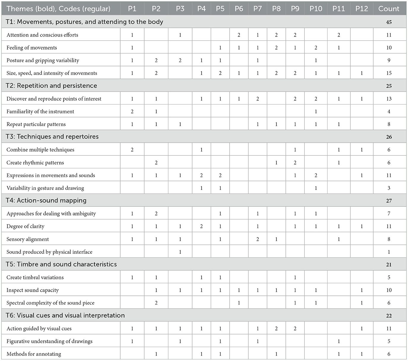 Then we gathered all the narratives and performed a thematic analysis (Clarke and Braun, 2017). The analysis involved (i) reading through the data and identifying segments that connect to our research question, (ii) generating initial codes, (iii) organizing the codes into themes, and (iv) iteratively reviewing and refining themes. Themes emerged from iterative analysis of the data, with a focus on our overarching research question, and inspiration from literature on movement-sound interaction (Françoise et al., 2022) and body motion in DMI (Jensenius, 2022).
