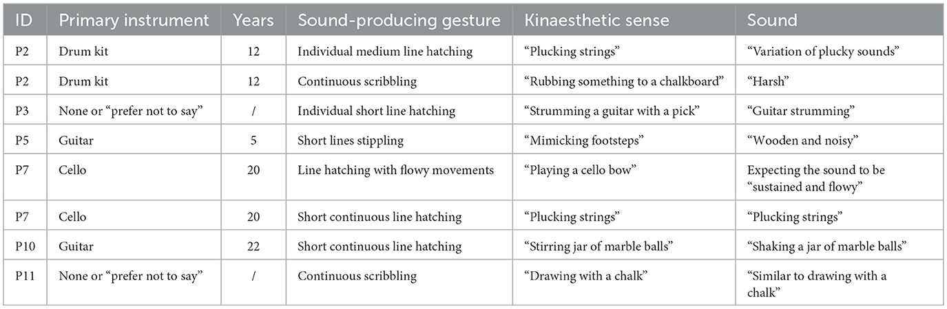We coded and categorized sound-producing gestures based on participants' notes and scores, with reference from the literature on sketching techniques (Lohan, 2012, p. 15–25) and gestural sonic objects (Godøy, 2006). The purpose is to showcase how participants' choice of gestures progresses from their initially perceived affordances to the final set of techniques used on their scores. This is inspired by related works on embodied cognition that capture techniques adaptions in musical instruments (Mice and McPherson, 2022).
