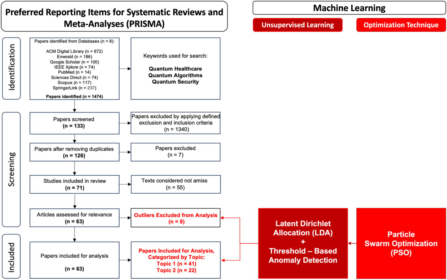 A systematic method was employed to identify, filter, and process the dataset, ensuring a rigorous selection of relevant studies on Quantum Computing with a focus on Healthcare, Algorithms, and Security. The screening process incorporated automated and manual techniques, alongside machine learning-driven optimization, to refine the dataset. Initially, duplicate entries were removed by leveraging Python-based preprocessing techniques. The dataset was processed using Pandas for data manipulation and NLTK for natural language processing, ensuring that each study was assessed based on its title and author information to detect exact duplicates. This was followed by a manual verification to eliminate any remaining redundancies overlooked by the automated step. Following deduplication, a structured review of the articles was conducted by applying predefined inclusion and exclusion criteria. Any disagreements among researchers regarding the inclusion of specific studies were resolved through discussion until a unanimous consensus was reached. This phase allowed the data set to be refined to 63 articles included in the review from 71 articles considered eligible, from which an additional 8 studies were excluded as outliers identified for nonalignment. The selected articles were structured into a spreadsheet format to facilitate systematic processing. To ensure consistency, a comprehensive stopword list was created by merging standard stopwords from NLTK with a customized list of terms deemed irrelevant to the study’s thematic focus. The text cleaning process involved removing numerical values and punctuation, converting text to lowercase, and eliminating stopwords. The cleaned document was defined as follows equation 1: