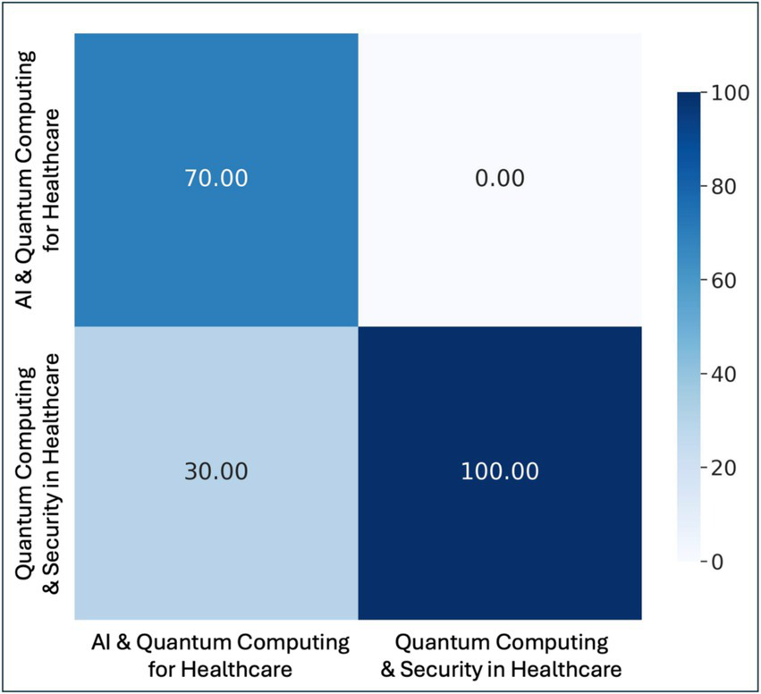 The topics identified through LDA and PSO will undergo further classification based on cross-cutting characteristics common to all 63 selected studies. This additional step will allow for refinement and contextualization of the thematic clusters, ensuring that they represent broader interdisciplinary connections and emerging trends in the study of Quantum Computing, with a particular focus on Healthcare, Algorithms, and Security. To ensure an accurate assignment of topics, a performance evaluation of the predictive model was conducted using advanced statistical metrics, based on the confusion matrix. The key metrics considered are as follows: