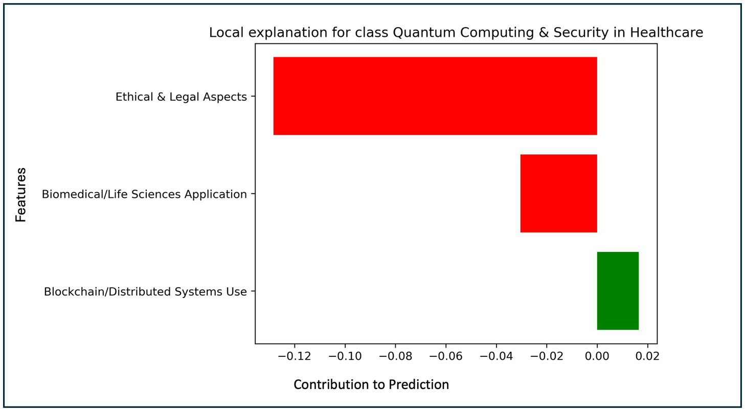 where is the true label (0 or 1) of the i-th document, and is the probability estimate of belonging to one of the two thematic categories. The integration of a Gradient Boosting-based predictive model ensured a robust and effective approach for categorizing studies related to quantum computing in healthcare. The strategic selection of features improved model accuracy and interpretability, reinforcing the methodological rigor of the analysis and providing a clear understanding of the impact of key factors in the emerging landscape of quantum computing applications in healthcare and technology.