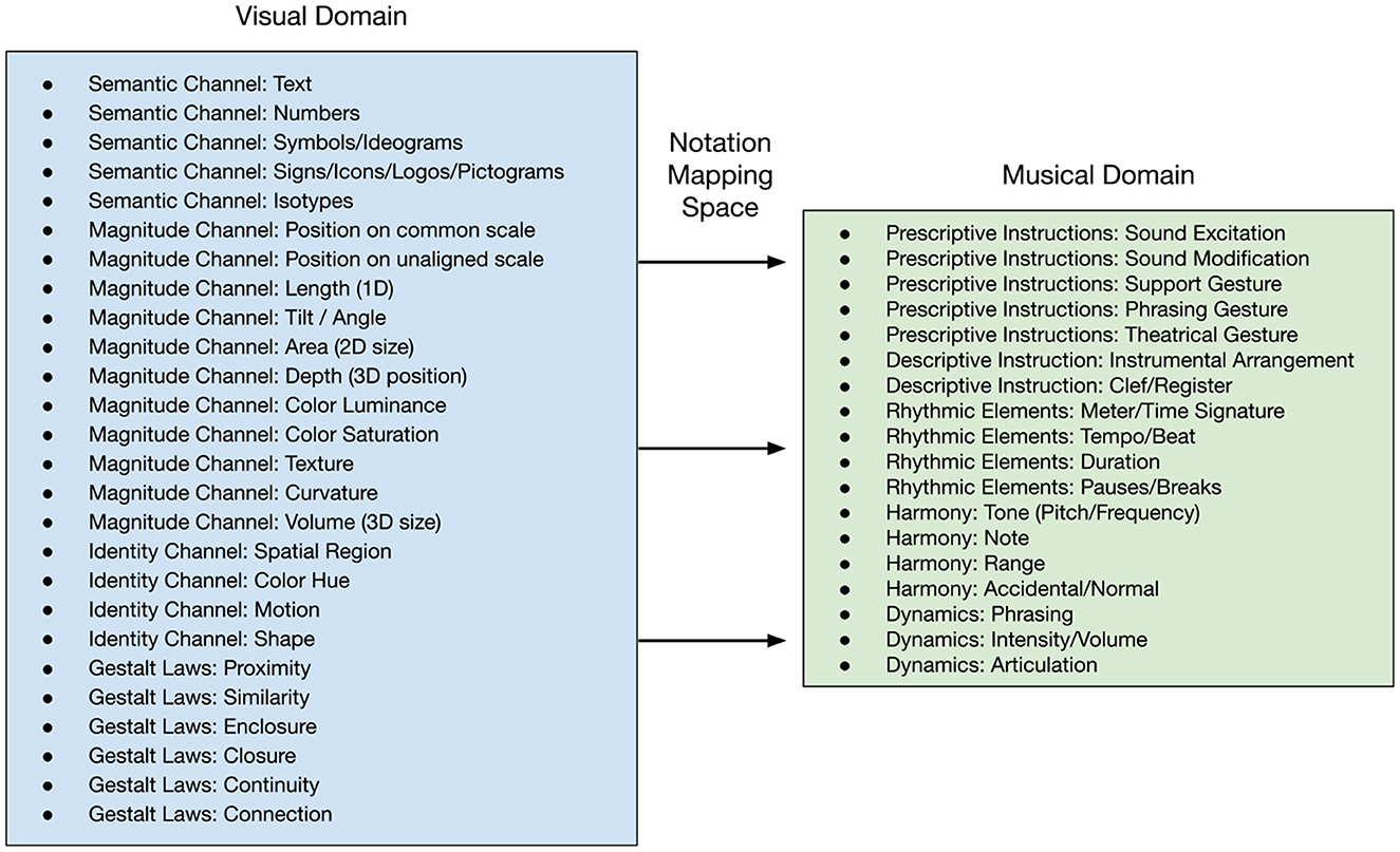 Miller, M., Häußler, J., Kraus, M., Keim, D., and El-Assady, M. (2018). Analyzing visual mappings of traditional and alternative music notation. arXiv [Preprint]. arXiv:1810.10814. doi: 10.48550/arXiv.1810.10814