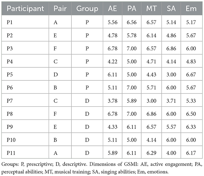 Due to withdrawal from the study, one pair was left incomplete. However, mean GMSI “general sophistication” remained very close between groups (D = 5.54, P = 5.57).